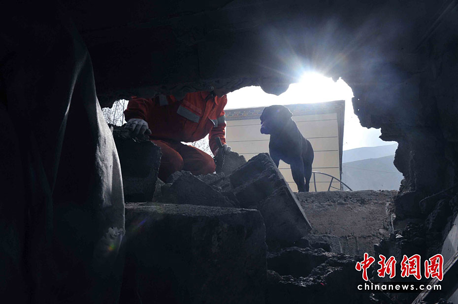 名貴的黑貝犬是中國國家救援隊趕赴青海玉樹地震災(zāi)區(qū)6只搜救犬隊成員之一,身價近百萬元人民幣。4月21日清晨八時許,它在救援隊員的帶領(lǐng)下,到玉樹地震災(zāi)區(qū)中心商業(yè)街廢墟里,四處奔波,盡職盡力尋找生命跡象。10時后,他和救援隊員都出現(xiàn)高原反應(yīng),暫時休整,準(zhǔn)備再戰(zhàn)。賈國榮 攝