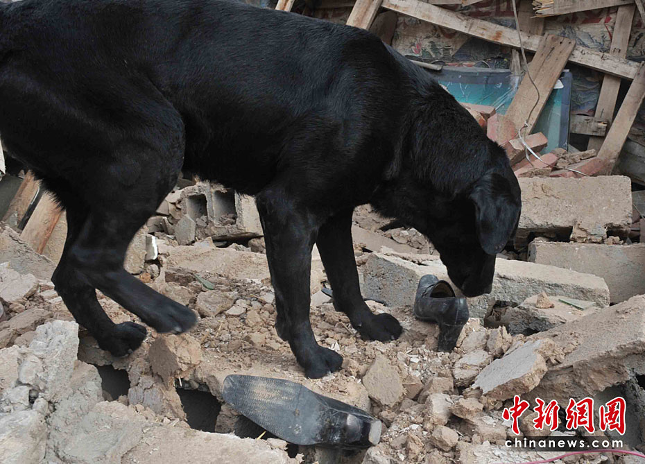 搜救犬黑貝玉樹地震廢墟上的一個清晨