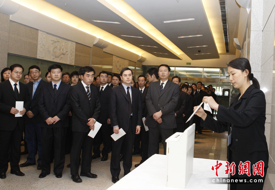 當(dāng)?shù)貢r(shí)間4月21日,中國駐紐約總領(lǐng)館舉行儀式,沉痛悼念青海玉樹地震遇難同胞。圖為悼念儀式后,中國駐紐約總領(lǐng)事館全體工作人員為青海玉樹捐款。中新社發(fā) 魏晞 攝
