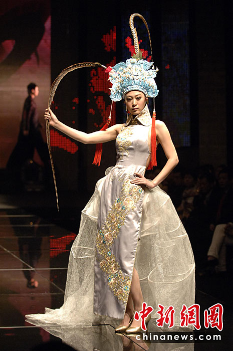 4月20日晚,首屆海西國際時裝周在福建石獅閉幕,本屆時裝周吸引了來自海峽兩岸的紡織服裝界企業家和知名服裝設計師。期間舉辦了12場時裝品牌和設計師作品動態發布會。圖為模特展示古今潮流結合的服裝。王東明 攝