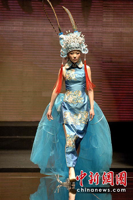 4月20日晚,首屆海西國際時裝周在福建石獅閉幕,本屆時裝周吸引了來自海峽兩岸的紡織服裝界企業家和知名服裝設計師。期間舉辦了12場時裝品牌和設計師作品動態發布會。圖為模特展示古今潮流結合的服裝。王東明 攝
