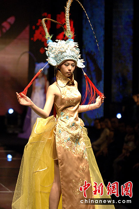4月20日晚,首屆海西國際時裝周在福建石獅閉幕,本屆時裝周吸引了來自海峽兩岸的紡織服裝界企業家和知名服裝設計師。期間舉辦了12場時裝品牌和設計師作品動態發布會。圖為模特展示古今潮流結合的服裝。王東明 攝