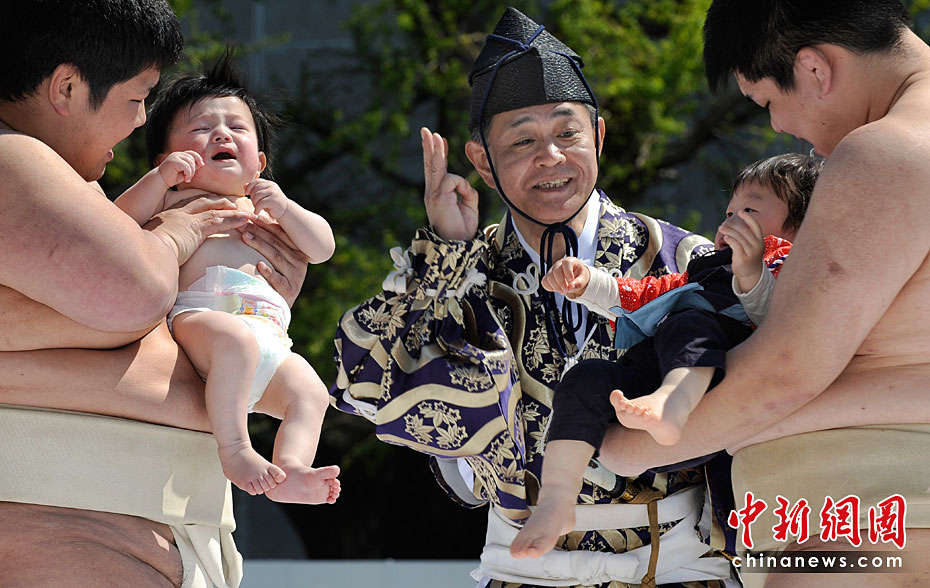 4月25日,日本東京,幾名相撲手手抱嬰兒,正努力使嬰兒哭泣。當日,一年一度的日本一周歲以下嬰兒啼哭大賽在東京淺草寺舉行。第一個讓嬰兒哭泣的選手將贏得比賽,日本通過此種比賽為孩子的健康祈福,他們認為嬰兒哭泣將對他們將來的身體健康有利。圖片來源:中國新聞網(wǎng)