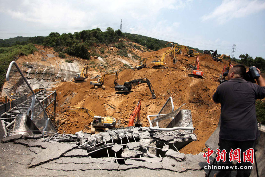 4月26日,臺灣“北二高”基隆段山崩斷橋意外第2天,工程人員繼續開挖,將攔腰被斬斷的路橋拆除,但尚未尋獲被埋的數輛人車。圖為當日中午,記者另繞山路爬上斷橋拍到的情景,依然觸目驚心。中新社發 董會峰 攝