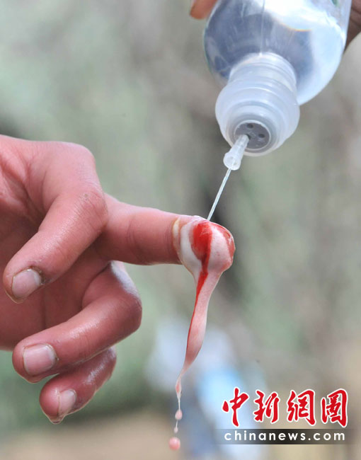 武警青海總隊玉樹支隊是最先投入抗震救災的先鋒部隊,地震發生時恰逢部隊出操,營房嚴重受損而官兵平安無恙。這里立即成為抗震救災的軍民和媒體的大本營之一,醫療救護隊和新型炊事車晝夜為軍民服務。集結在地震災區的各路部隊從4月低之前全面轉入安置群眾和災后重建,這里的的后勤已經得到基本保障。 圖為官兵手部受傷,用藥品沖洗。 中新社記者 賈國榮 攝