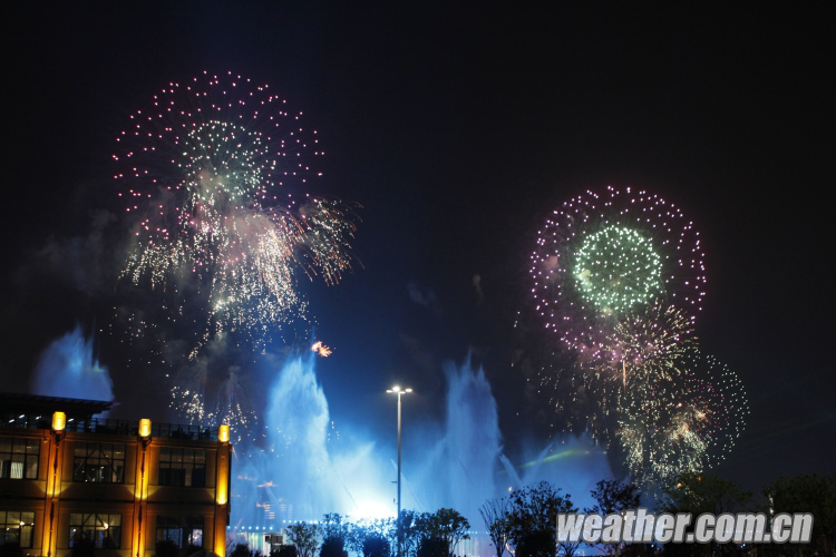 2010年4月27日,上海世博會開幕式彩排順利進行。圖為噴泉與煙花一同表現世博會主題。卞赟 攝