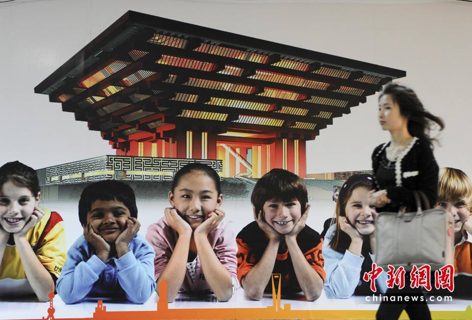 4月29日,一位女士經過上海地鐵通道里的世博會海報前。世博會開幕前,面臨“大考”的上海充滿喜慶氣氛。 中新社發 廖攀 攝