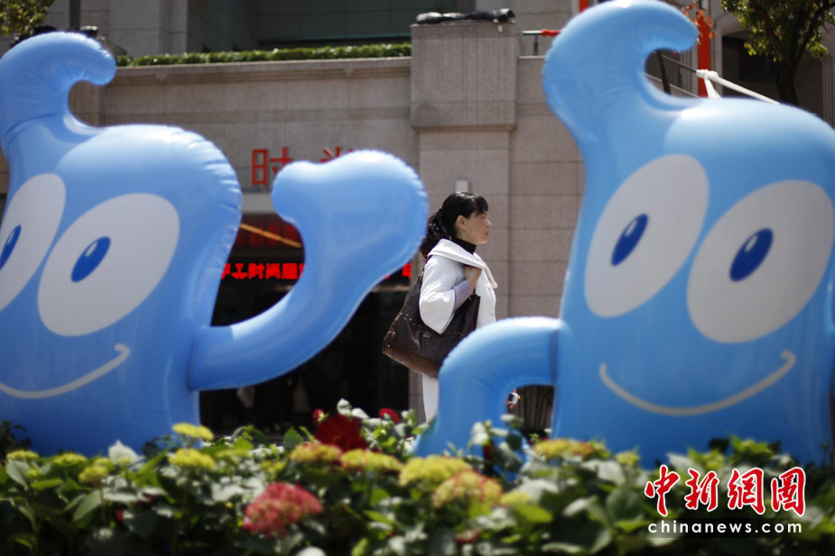 4月29日,上海街頭的世博會吉祥物海寶和行人。世博會開幕在即,面臨“大考”的上海充滿喜慶氣氛。 中新社發 廖攀 攝