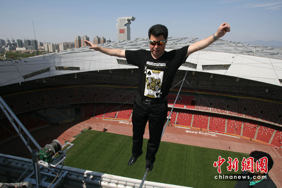 4月29日,有高空王子之稱的新疆小伙阿迪力在鳥巢上空成功試演達瓦孜(高空走鋼絲)。5月3日起,他將在北京國家體育場(鳥巢)頂棚上搭建的小屋生存60天,其間每天將進行約5個小時的高空走鋼絲表演。 中新社發(fā) 蘇丹 攝