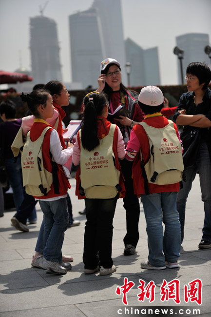 30日上午,記者在上海外灘采訪時遇到小主人報新聞學校的“小記者”們在采訪,成為他們今天的第一個采訪對象!靶∮浾摺眰冏铌P心的問題是關于世博會,“如何讓世界變得更美好”。她們都表示非常想去看世博會,最想看的是中國館,但是要留到最后看,“因為其它館都會拆掉,中國館會保留下來”!靶∮浾摺眰冋f,自己要從身邊小事做起,做有文明有素質的人,并表示希望自己將來成為真正的“大記者”,更好地報道上海。吳歆/文 王紅綱/圖