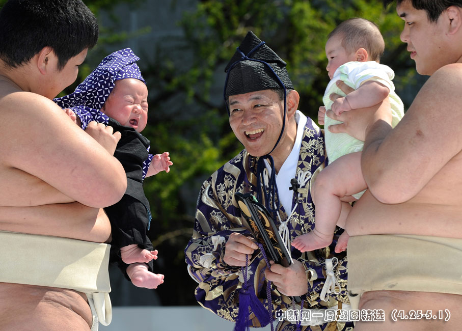 4月25日,日本東京,幾名相撲手手抱嬰兒,正努力使嬰兒哭泣。當日,一年一度的日本一周歲以下嬰兒啼哭大賽在東京淺草寺舉行。圖片來源:中國新聞網>>點擊觀看詳細內容