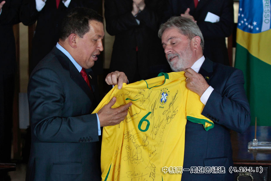 4月28日,巴西總統盧拉在巴西利亞伊塔馬拉蒂宮向來訪的委內瑞拉總統查韋斯贈送由巴西球星簽名的球衣。圖片來源:中國新聞網>>點擊觀看詳細內容
