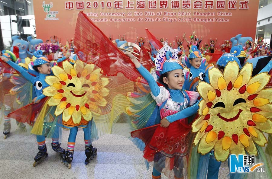 5月1日,中國(guó)2010年上海世博會(huì)開園儀式在上海世博園世博中心舉行。這是小朋友們?cè)陂_園儀式上表演。裴鑫攝(新華網(wǎng))