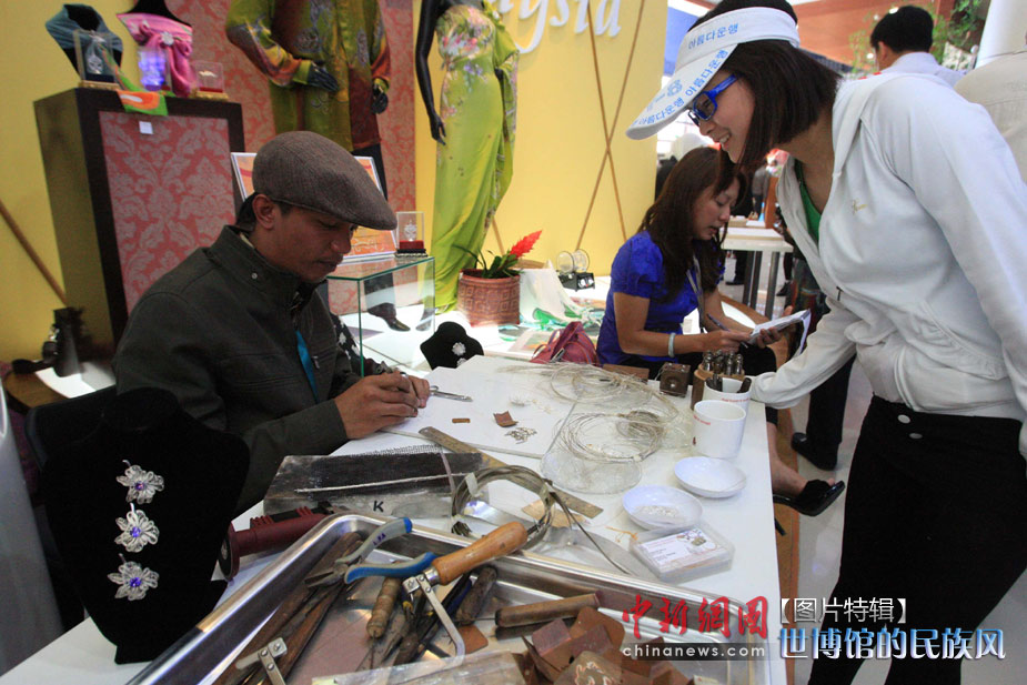5月1日,上海世博會馬來西亞館開館,手工藝人用金銀絲打造漂亮的胸針,讓參觀者驚訝不已。中新社發 潘索菲 攝。
