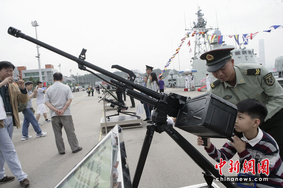 為慶祝“五一”國際勞動節,進一步增進與香港社會各界相互溝通與交流,中國人民解放軍駐香港部隊5月1日開放了昂船洲軍營,共有約13000名市民前往參觀。圖為香港市民近距離參觀武器展示。中新社發 張勤 攝