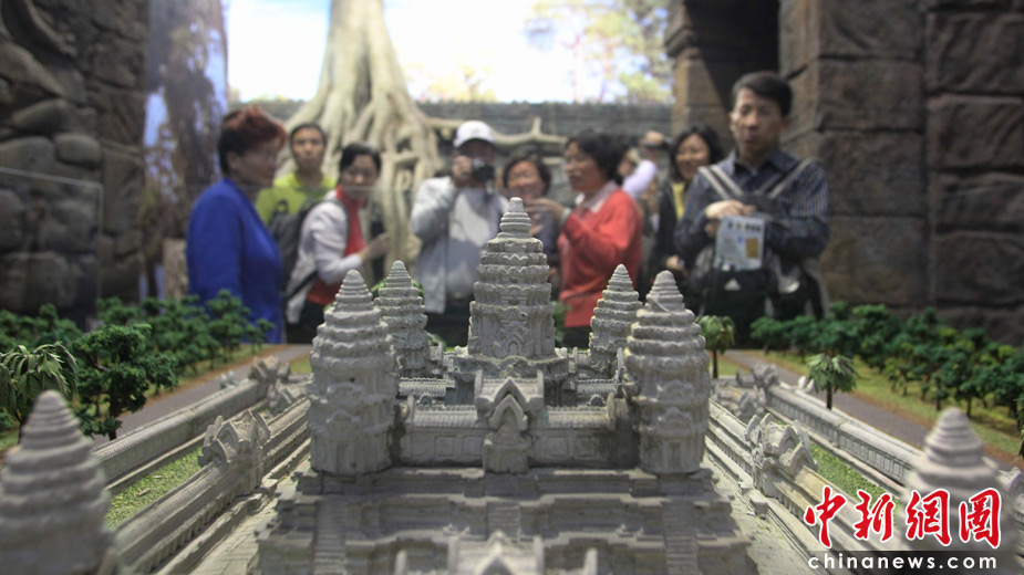 5月1日,觀眾在世博會柬埔寨館內觀賞吳哥窟模型。當日,上海世博會柬埔寨館開館。中新社發 蘇丹 攝