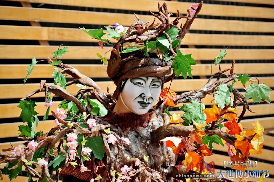 5月1日,上海世博會正式開園,當日有20萬人次的游客參觀了世博園。世博首日,許許多多的小細節都帶給人一種全新的體驗。圖為在加拿大館一位扮作大樹的表演者。