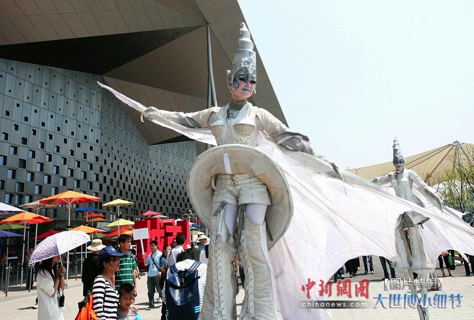 5月1日,上海世博會正式開園,當日有20萬人次的游客參觀了世博園。世博首日,許許多多的小細節(jié)都帶給人一種全新的體驗。圖為荷蘭演員在上海世博園主題館前表演長腳舞。中新社發(fā) 袁云 攝