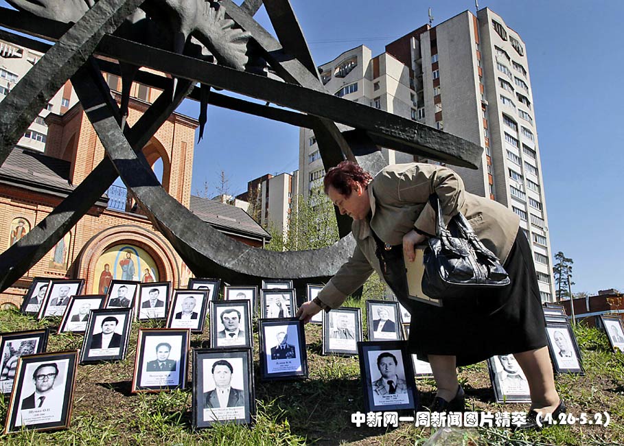 26日(周一),一名婦女在基輔紀念切爾諾貝利爆炸中死亡的丈夫。當(dāng)日烏克蘭等國紀念切爾諾貝利核泄漏事故24周年。