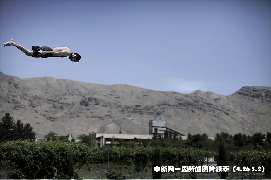 28日(周三),一名阿富汗男子在游泳池上進行跳水,享受陽光。