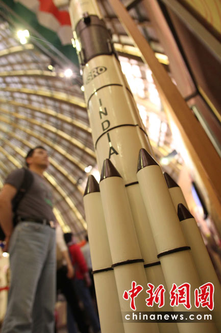5月2日,觀眾在上海世博會印度館參觀印度的“一箭十星”火箭模型。2008年4月,印度一舉把10顆衛星送入軌道,這是世界首次“一箭十星”成功發射。中新社發 蘇丹 攝