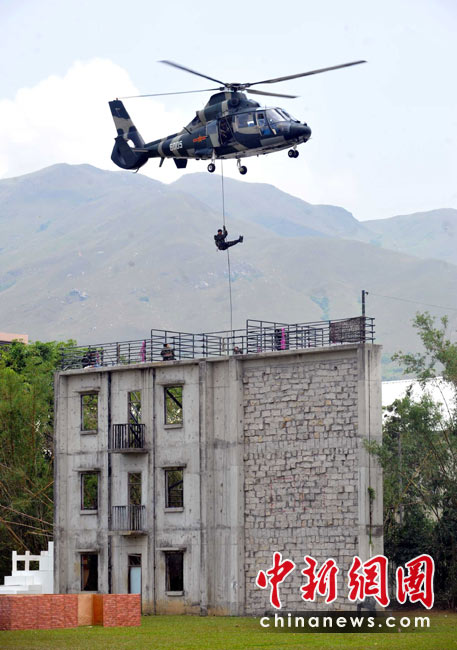 為慶祝“五一”國際勞動節,進一步增進與香港社會各界相互溝通與交流,中國人民解放軍駐香港部隊5月2日開放了石崗軍營。圖為駐港部隊反恐突擊和陸空協同救援演練表演。 中新社發 鄧慶樂 攝