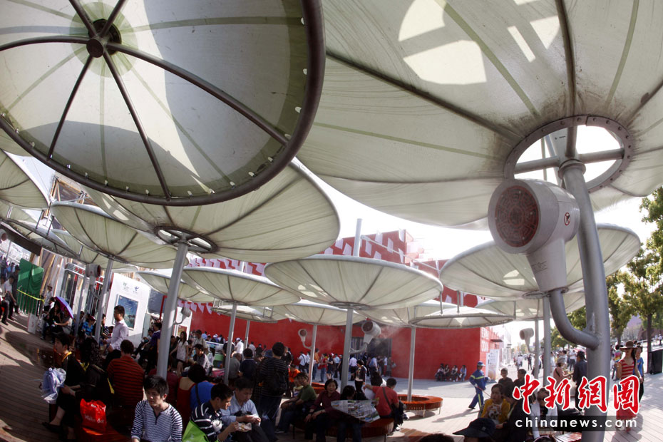 2010年5月2日,上海世博園區(qū)啟動各項控溫降溫設(shè)施應(yīng)對高溫。圖為游客休息區(qū)內(nèi)啟動噴霧降溫系統(tǒng)。中新社記者 盛佳鵬 攝