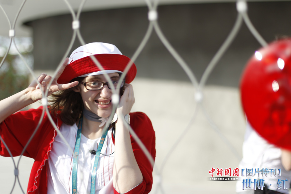 紅色象征著熱量與活力,紅色也象征著興奮與激情,在世博園區(qū)內(nèi)游覽,總會(huì)有一抹濃艷的紅色闖入到記者鏡頭之中,讓世博變得更加火辣。圖為一位外國(guó)游客向面對(duì)鏡頭問好。中新社記者 盛佳鵬 攝