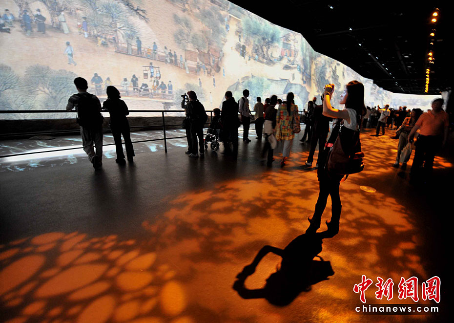 5月2日,中外觀眾依然最熱捧上海世博會中國館的“鎮館之寶”——巨幅放大電子動態版的北宋畫家張擇端名作《清明上河圖》。此世博版的《清明上河圖》高6.3米,長130余米,約是原圖的30倍,需要12臺電影級的投影儀同時工作。整個活動畫面以4分鐘為一個周期,盡展宋朝盛世的都市日夜風情。中新社記者 賈國榮 攝