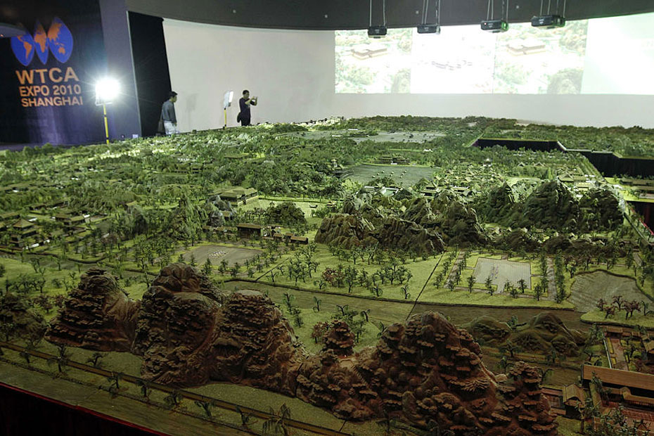 5月4日,游客在參觀縮微版“圓明園”。近日,一座“全景式巨型立雕圓明園”在上海世博會世界貿易中心協會館亮相。這座縮微版的“圓明園”以1比150的比例制作而成,再現了全盛時期的圓明園雄偉壯觀的全景。圖片來源:新華網 裴鑫 攝