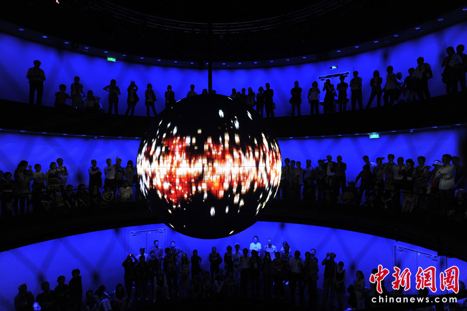 德國館的高潮就是它的最后部分“動力之源”?梢匀菁{600人的動力之源大廳圓形環(huán)廊是一個圓錐形空間,中間懸掛著一個重達1.5噸、直徑達3米的巨大金屬球,四周則有一圈供游客駐足的走廊。黑漆漆的大廳里,兩個虛擬主持人邀請觀眾同時大聲吶喊。隨著吶喊聲的加大,動力球慢慢擺動起來,聲音越大擺動幅度越大,甚至繞圈飛行。圓球表面40萬根發(fā)光的LED管,逐漸閃現(xiàn)出德國人對未來城市生活的暢想畫面。這是一場7分鐘的互動體驗。在這里觀眾才是主角。中新網(wǎng)記者 王紅綱 攝