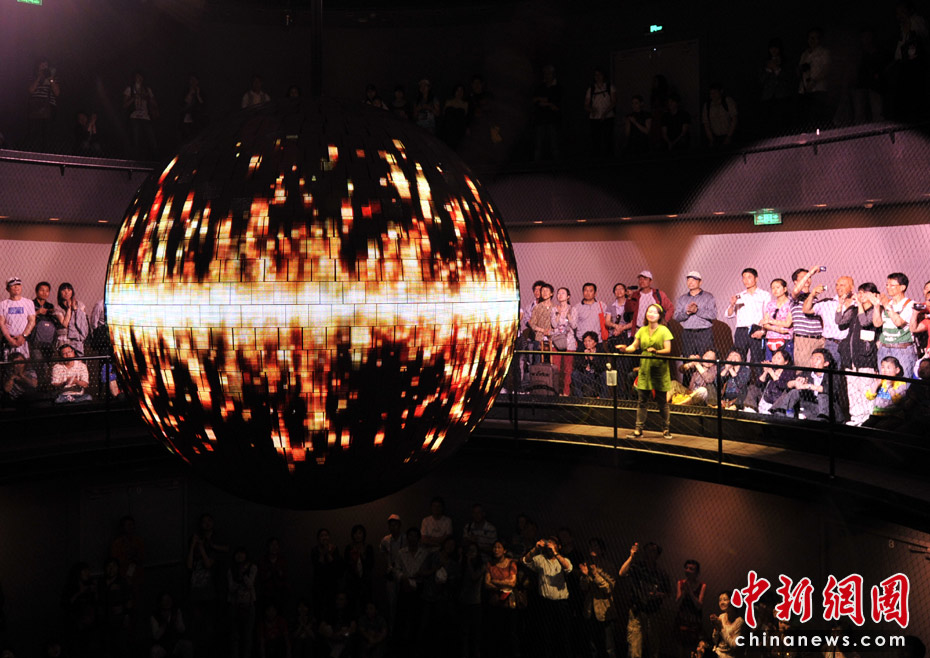 德國(guó)館的高潮就是它的最后部分“動(dòng)力之源”。可以容納600人的動(dòng)力之源大廳圓形環(huán)廊是一個(gè)圓錐形空間,中間懸掛著一個(gè)重達(dá)1.5噸、直徑達(dá)3米的巨大金屬球,四周則有一圈供游客駐足的走廊。黑漆漆的大廳里,兩個(gè)虛擬主持人邀請(qǐng)觀眾同時(shí)大聲吶喊。隨著吶喊聲的加大,動(dòng)力球慢慢擺動(dòng)起來(lái),聲音越大擺動(dòng)幅度越大,甚至繞圈飛行。圓球表面40萬(wàn)根發(fā)光的LED管,逐漸閃現(xiàn)出德國(guó)人對(duì)未來(lái)城市生活的暢想畫面。這是一場(chǎng)7分鐘的互動(dòng)體驗(yàn)。在這里觀眾才是主角。中新網(wǎng)記者 王紅綱 攝