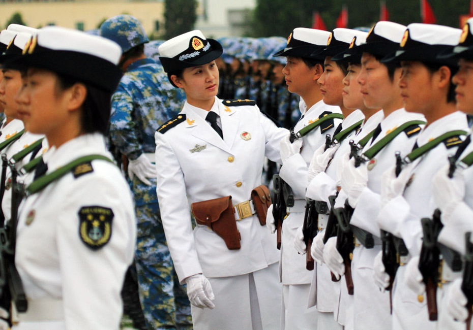 參加閱兵式的海軍陸戰(zhàn)隊(duì)女隊(duì)員在做準(zhǔn)備。圖片來源:新華網(wǎng) 查春明攝