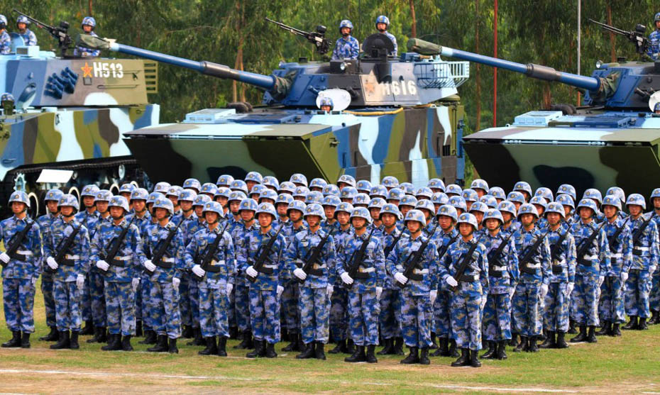海軍陸戰隊員和新型裝備接受檢閱。圖片來源:新華網 查春明攝