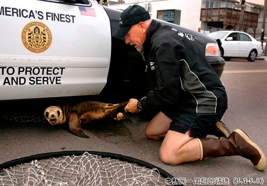 5月5日,在加利福尼亞州,動物護理專家羅賓森把一頭小海豹從圣地亞哥警車下拖出。小海豹之前在另一輛車下被發現,看到警察要捉它就躲到了這輛警車下。圖片來源:中國新聞網>>點擊觀看詳細內容