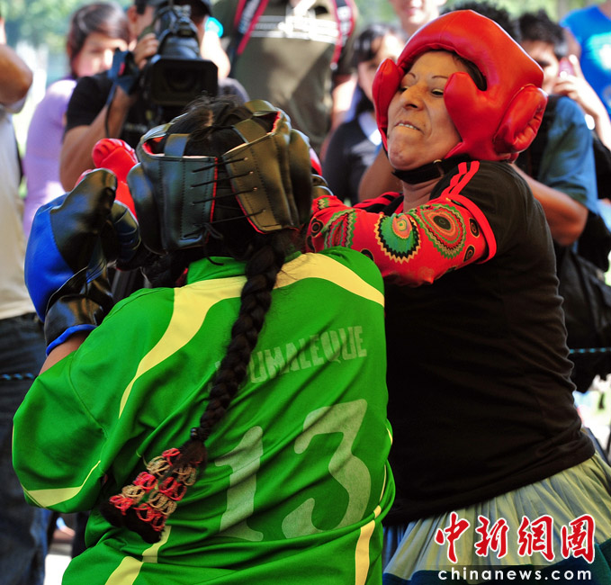 5月13日,秘魯利馬高地舉辦的傳統食品博覽會上,兩名安第斯農民婦女穿著象征秘魯和玻利維亞的裙子同臺搏擊妙趣橫生。圖片來源:中國新聞網