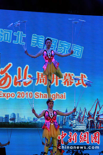 5月14日,上海世博會“河北活動周”在寶鋼大舞臺啟幕,戰鼓、旱船、拉花、草編、石雕、年畫、雜技、皮影戲……燕趙大地的傳統絕活一一登場。“河北活動周”自14日持續至18日,將圍繞“京畿神韻”的主線,向世界展示河北省的經濟和藝術魅力,是繼直轄市北京、天津之后,第一個由省份在世博會上舉辦的活動周。中新社記者 殷春永 攝