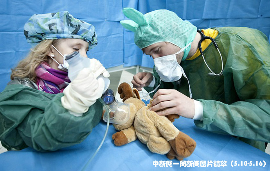 周一(10日),在德國柏林的菲爾紹臨床中心的“泰迪熊醫院”,萊奧尼(Leonie, 左)和一名醫科學生在為一個毛茸玩具動手術。這家醫院旨在減輕孩子們對醫生和醫療設備的恐懼感。