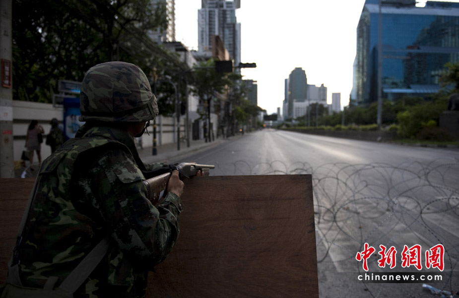 泰國軍隊和反政府的“紅衫軍”16日繼續在曼谷的多處地點對峙,槍聲和爆炸聲不時響起,曼谷的部分街道已成為“戰區”。泰國急救醫療部門17日表示,泰國軍警與反政府“紅衫軍”示威民眾3天來在曼谷街頭爆發的沖突,死亡人數已經上升到35人。圖片來源:中國新聞網