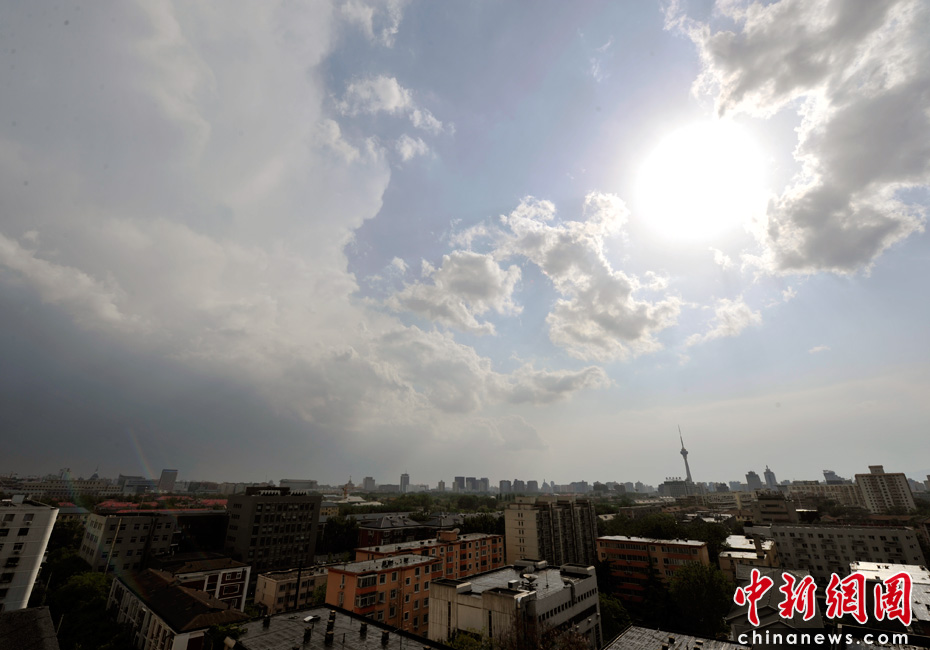 5月18日16時許,伴隨陣陣雷聲京城突降大雨,降雨過后東部天空依然籠罩著烏云,而西邊卻已放晴。中新網記者 金碩 攝