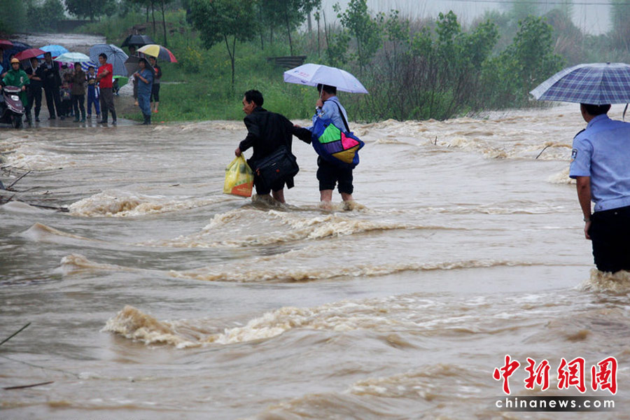 2010年5月18日,江西省婺源縣太白鎮朱村村民在當地公安干警的護送下通過被淹公路橋。當日,江西全省近50個縣出現普降暴雨,其中婺源縣、 降雨量以婺源縣153毫米為最大,當地已緊急轉移群眾4000余人。到筆者發稿止,在該縣太白鎮通往德興市的主要公路被迫中斷,樂安河太白段水位均已超出警界線。卓忠偉/CFP