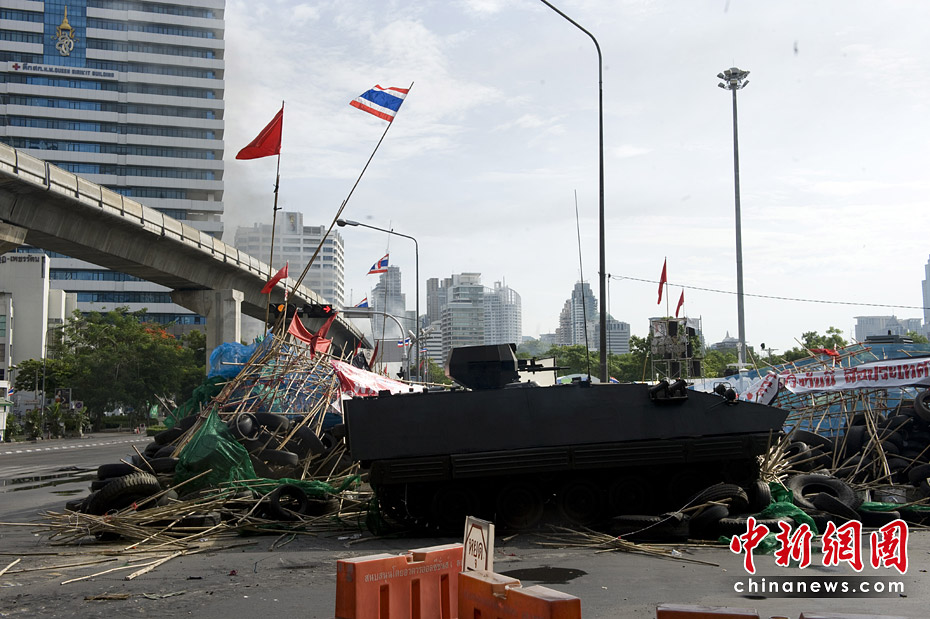 19日泰國軍方對聚集在首都曼谷市示威的反政府“紅衫軍”展開了驅散行動。軍方裝甲車已突破“紅衫軍”所筑路障,且至少有3人被槍擊中。圖片來源:中國新聞網