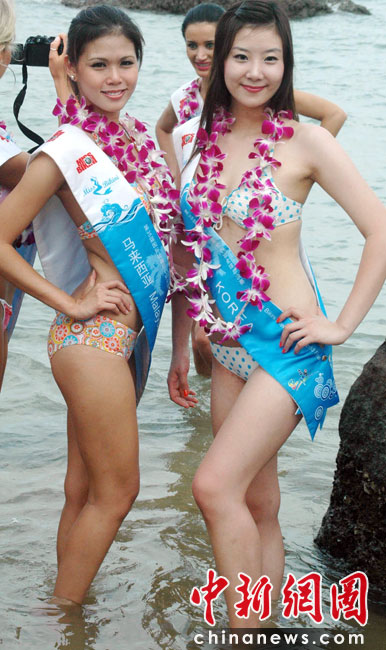 5月21日,海南三亞參加第35屆國際比基尼小姐全球總決賽的64位各國佳麗開始了她們在三亞為期9天的時尚美麗之旅。當日,佳麗們前往著名的天涯海角、大小洞天等景區,拍攝外景,體驗美麗的三亞熱帶風光,展現美麗風采。中新社記者 尹海明 攝