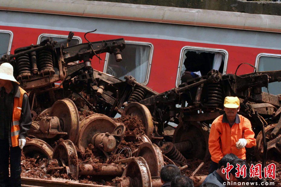 中新網東鄉5月23日電(艾永全 何柳斌 劉占昆)23日下午14時,距離滬昆鐵路客運列車脫線事發已經12小時,武警、消防、醫護、交警、特警仍在事故現場緊急救援。  艾永全 攝