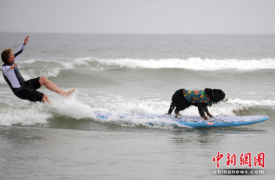 5月22日,美國加利福尼亞州圣迭戈舉行了一場妙趣橫生的狗狗沖浪比賽。圖片來源:中國新聞網