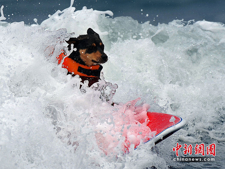 5月22日,美國(guó)加利福尼亞州圣迭戈舉行了一場(chǎng)妙趣橫生的狗狗沖浪比賽。圖片來(lái)源:中國(guó)新聞網(wǎng)