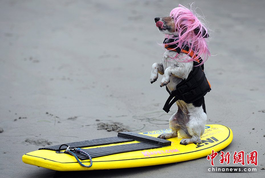 5月22日,美國加利福尼亞州圣迭戈舉行了一場妙趣橫生的狗狗沖浪比賽。圖片來源:中國新聞網