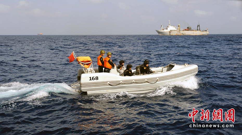 圖為特戰(zhàn)隊員從“廣州”艦換乘小艇到商船的情景。江山 攝