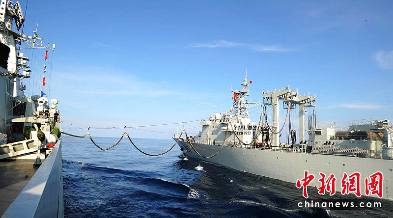 3月9日上午,第五批護航編隊在印度洋進行了首次海上補給!拔⑸胶本C合補給艦對“廣州”號導彈驅逐艦進行了橫向的液貨補給。江山 攝