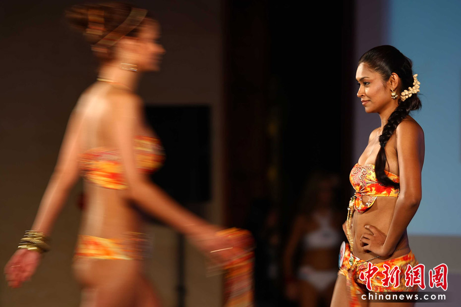 5月24日晚,在海南三亞參加第35屆國際比基尼小姐全球總決賽的64位各國佳麗們,展開了比基尼泳裝DIY設計和最佳身材的比拼。最終來自西班牙與烏克蘭的組合Marrero和Struk獲得了泳裝DIY設計的金獎。泰國佳麗Prapahan摘得最佳身材的桂冠。圖為佳麗們在展示自己設計的泳裝。中新社記者 富田 攝